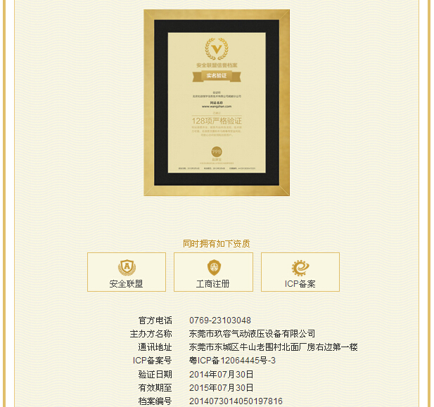 恭喜东莞市菠萝视频污版网址入口气动液压设备有限公司获得了安全联盟认证!菠萝视频污版网址入口通过了128项史上最严格的安全检测,并非常荣幸地载入安全联盟信誉档案库。菠萝视频污版网址入口将信守承诺,与安全联盟200万站长共同努力,为大家提供安全可靠的产品和服务。菠萝视频污版网址入口增压缸感谢您的支持!认证详情请查看荣誉证书http://t.cn/RPICS5j